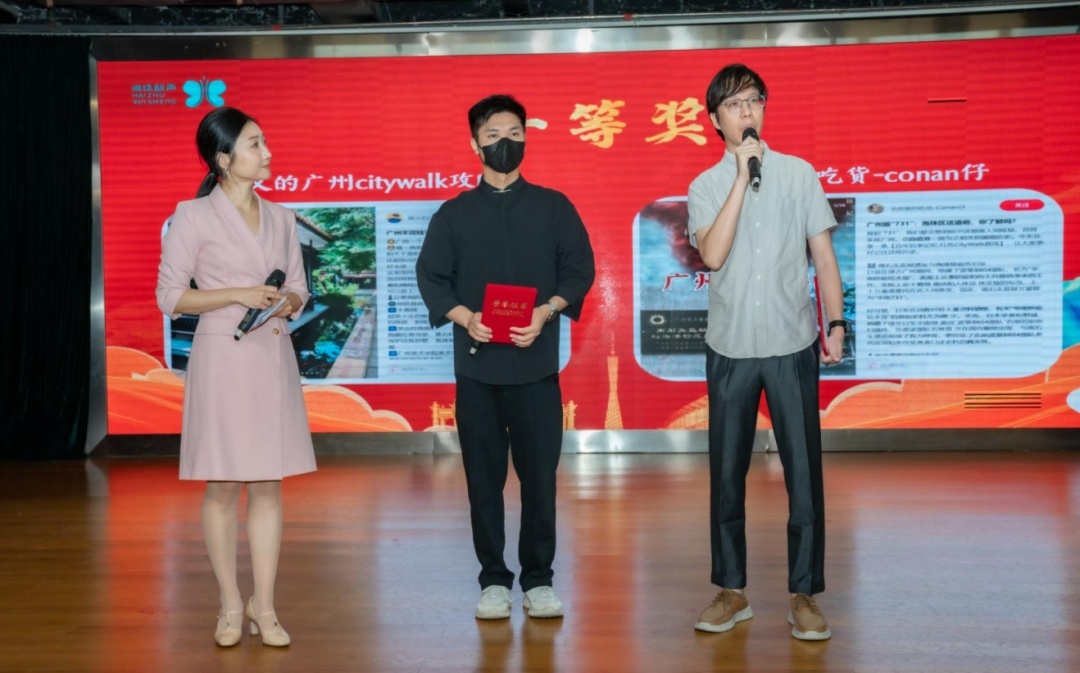 两位一等奖获奖选手“猫又的广州citywalk攻略”“书房里的吃货-conan仔”上台发表了获奖感言,二人均认为海珠红色文化资源十分丰富,希望有越来越多的朋友能走进海珠,用CityWalk的方式,亲身感受这片土地上的红色脉搏与文化魅力。